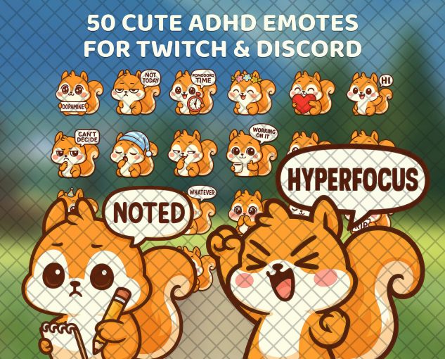 Sometimes an emote is worth a thousand words. This ADHD Emote Pack was born from a late-night chat with my ADHD friend. We wanted a fun, quick way to express how we actually feel in our conversations. That spark turned into a collection of 50 expressive squirrel emotes, each one capturing the playful chaos, focus bursts, and humor that come with an ADHD brain.