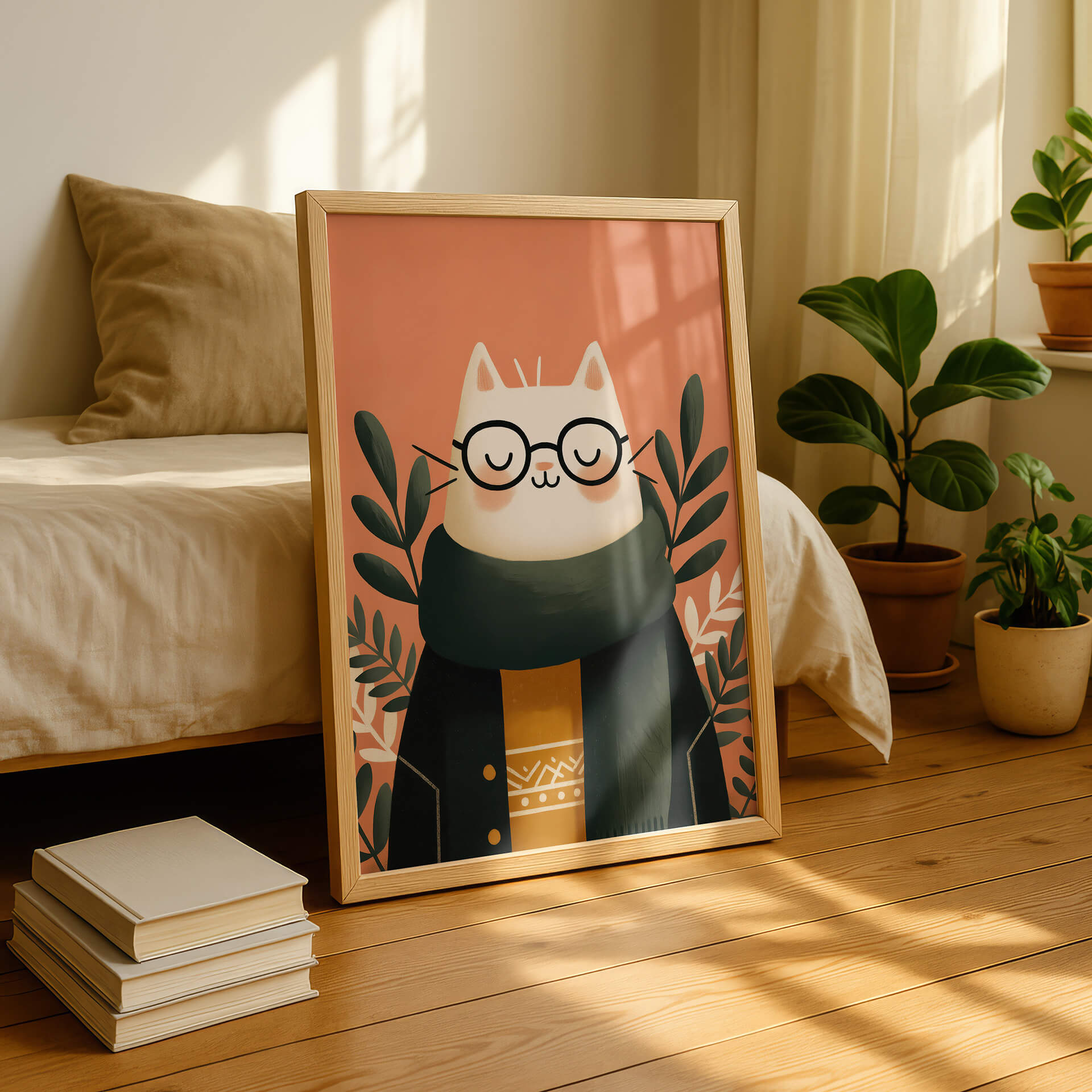Bring joy to your walls with this charming cat portrait, featuring a cozy sweater, oversized coat, and a smile that feels contagious. Perfect for cat lovers or anyone who enjoys playful, feel-good art, this print makes a delightful addition to living rooms, bedrooms, or creative spaces.